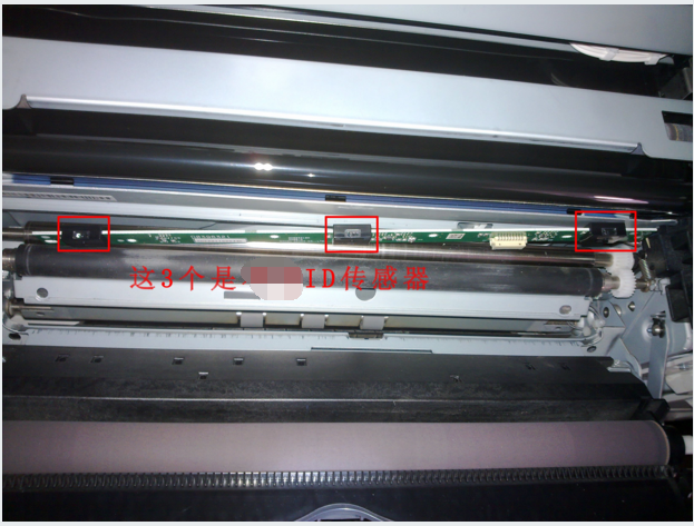 查 ID 传感器,靠机器内侧的 ID 传感器粘有墨粉,用酒精清洁 ID 传感器(位置见下图),故